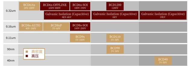 电源管理芯片主要采用BCD工艺制造,制程从0.32μm到90nm不等,间接导致了产品料号种类多,市场份额比较分散,长尾效应明显。由于产品众多且特性差异较大,各家晶圆厂/IDM厂商的BCD制程发展路线图有所差异,但是从下游应用的角度来看,BCD工艺主要朝向高压、高功率和高密度三个方向发展。